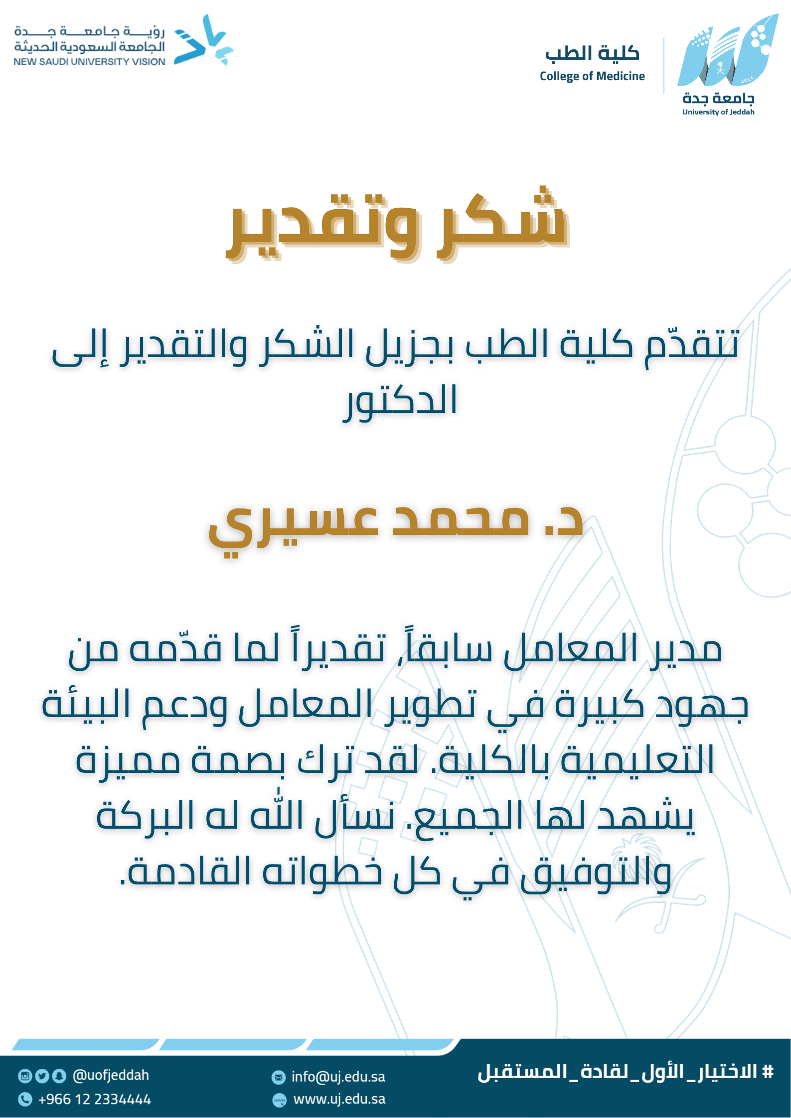 The College of Medicine extends its heartfelt gratitude to Dr. Mohammed Aseeri, former Director of Laboratories, in appreciation of his valuable efforts in developing the laboratories and enhancing the educational environment in the College. His positive impact and contributions will always be remembered. We wish him blessings and success in all his future endeavors.
