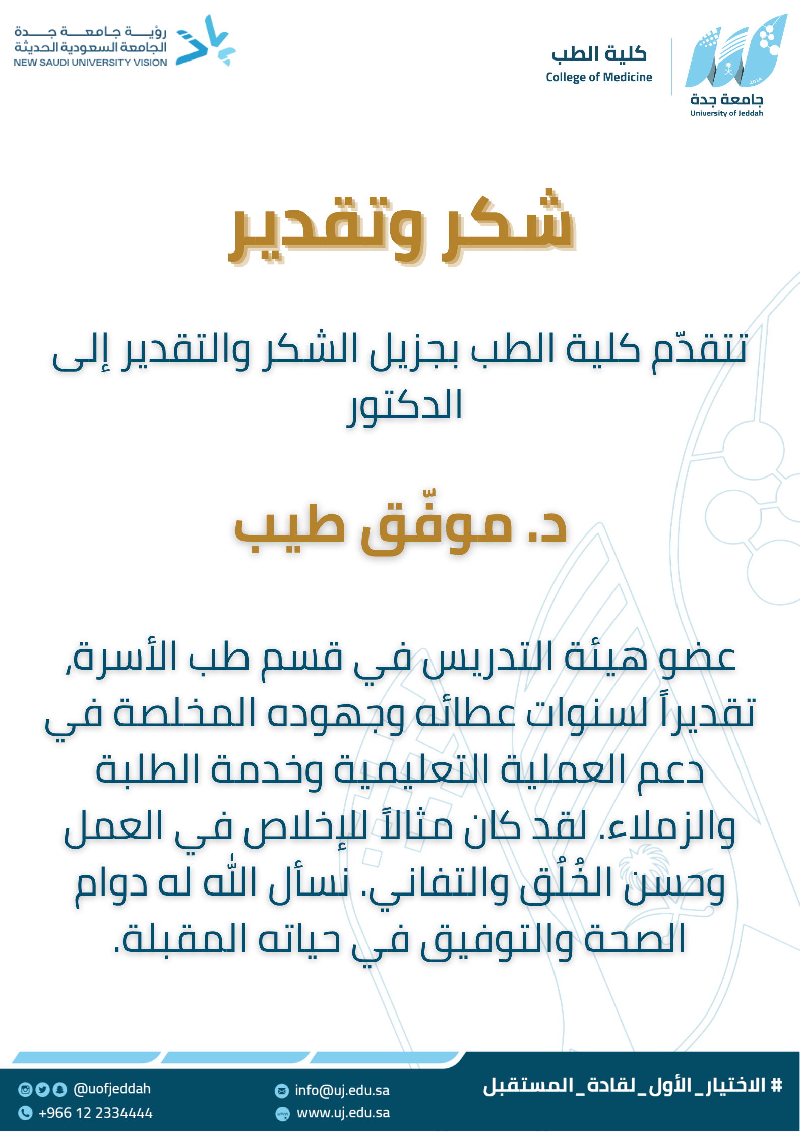The College of Medicine extends its sincere appreciation to Dr. Mowaffaq Tayeb, Faculty Member in the Department of Family Medicine, in recognition of his years of dedicated service, commitment, and contributions to the educational process and to supporting students and colleagues. He has been a model of professionalism, good character, and devotion to work. We wish him continued health and success in the next chapter of his life.